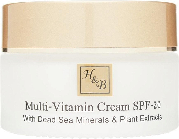 Мультивитаминный крем SPF-20 включает в себя комплекс витаминов С и Е в сочетании с маслом примулы вечерней, маслом облепихи, алоэ вера и активными минералами Мертвого моря. Все эти прекрасные ингредиенты вместе с солнцезащитными фильтрами UVA и UVB способствуют эластичности и сиянию кожи, а также предотвращают появление морщин. Крем восстанавливает влажность кожи, балансирует ее, а также рекомендуется в качестве основы под макияж. Мультивитаминный крем подходит для всех типов кожи.